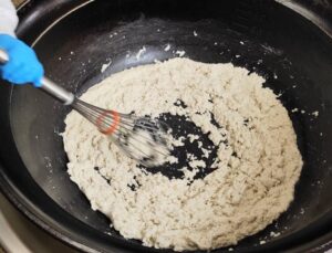 回転釜に、米粉と油を入れてひたすら炒めます。最初はボソボソとしていたけれど、だんだん滑らかに。
