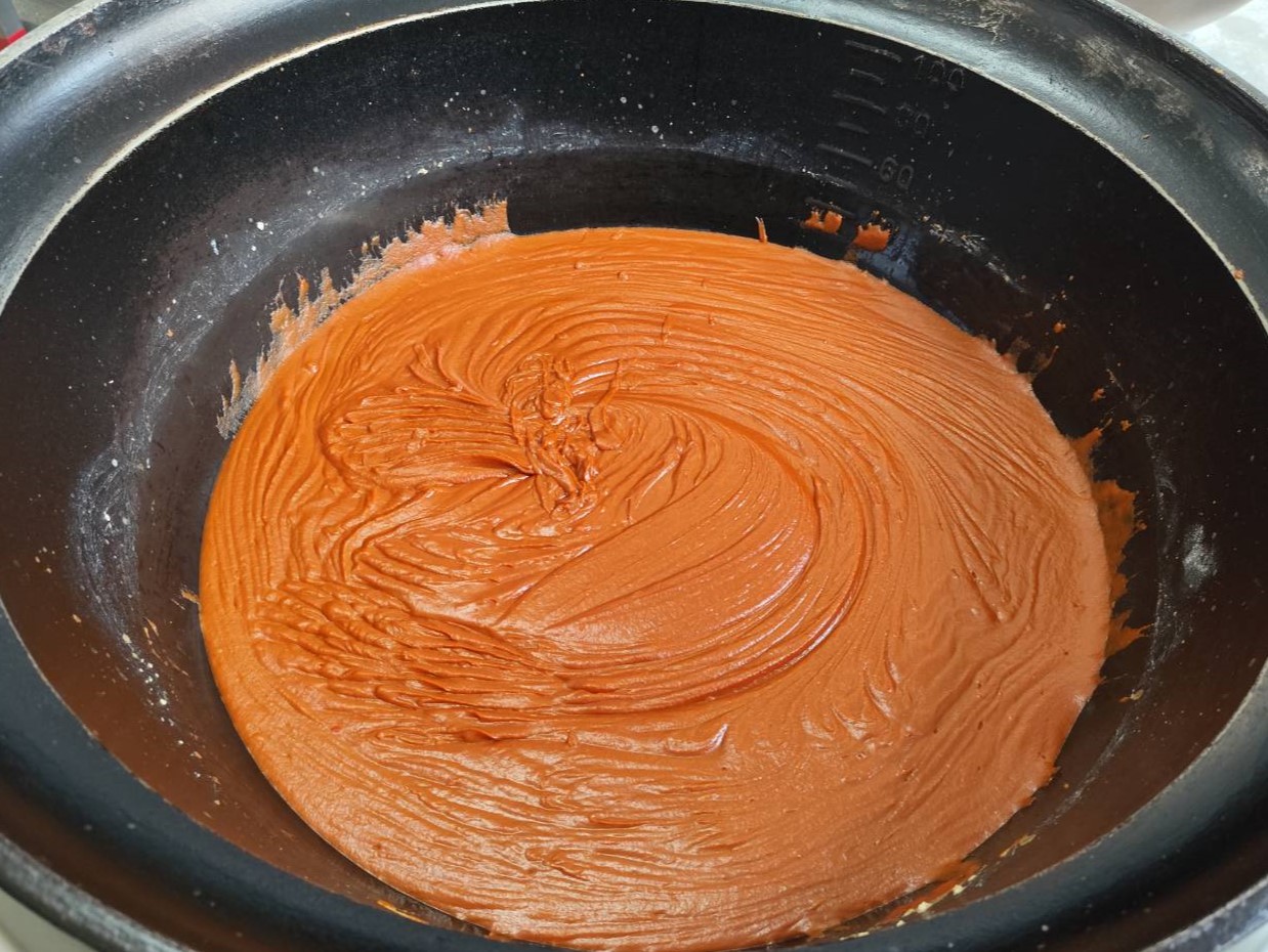 ひたすら混ぜ続け、色がついてきました。水、ケチャップ、トマトピューレを入れてブラウンルウの完成★