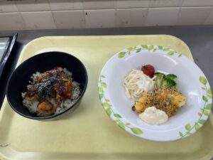 左)焼き鳥わさび丼 / 右)アジの赤しそカリカリパン粉焼き
